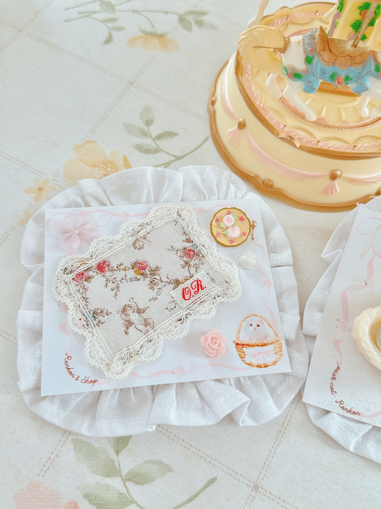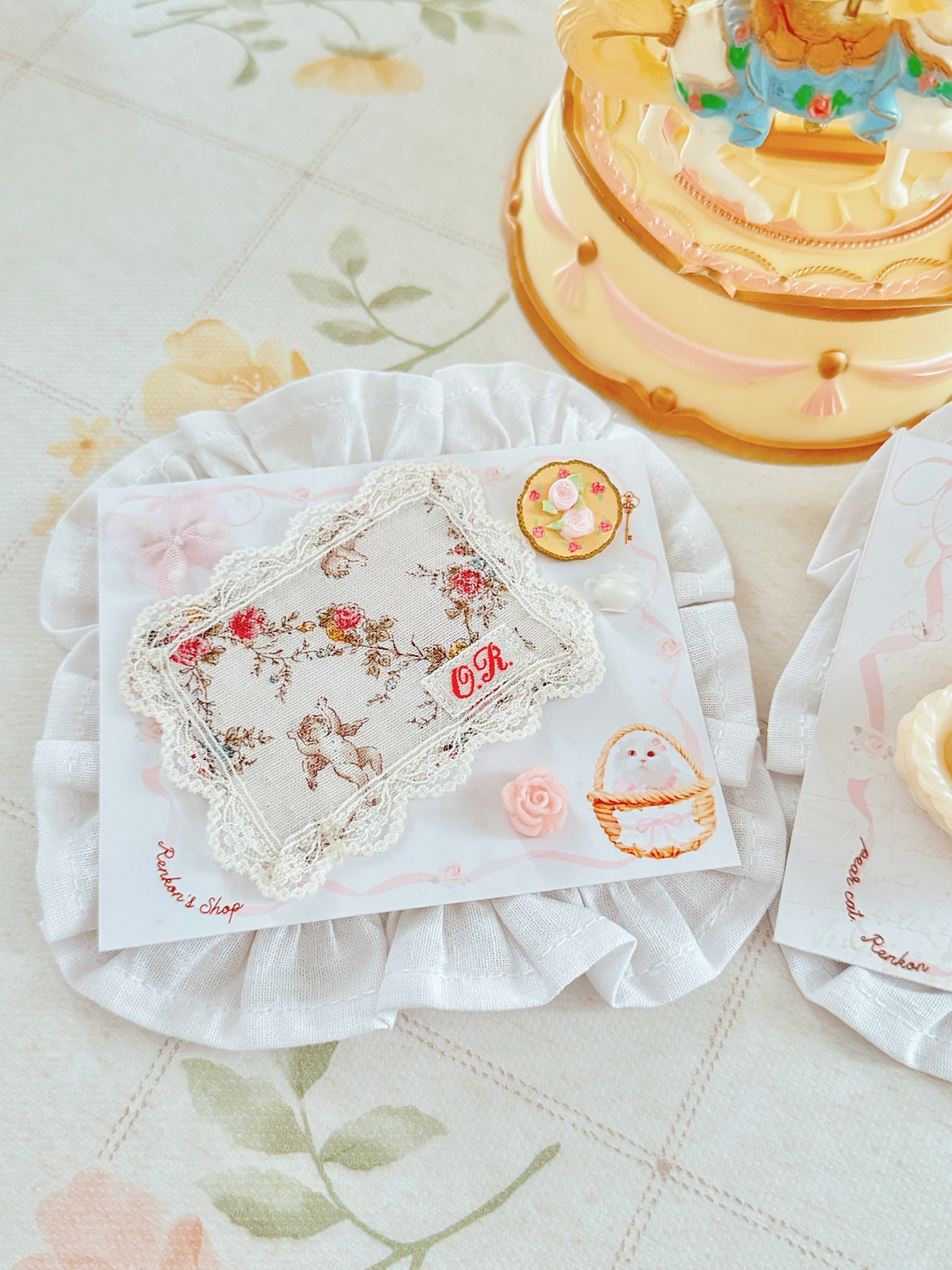 フランスアンティークのタグ付きカフェマットに、ローズのメレンゲクッキーとローズ柄のお皿、ポットのパーツをセットにしています♡