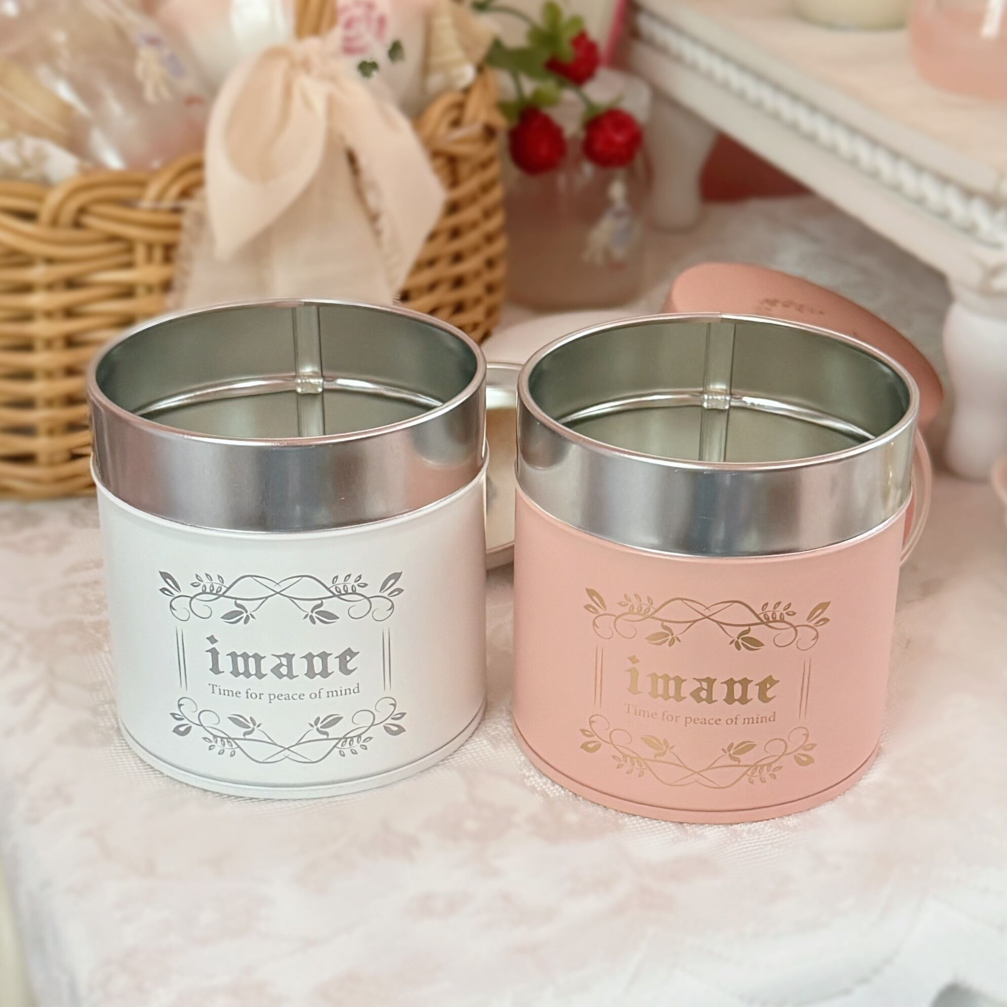 イマン ティン缶(コーヒー缶) ブリキ製 アンティークピンク/ホワイト【imane】