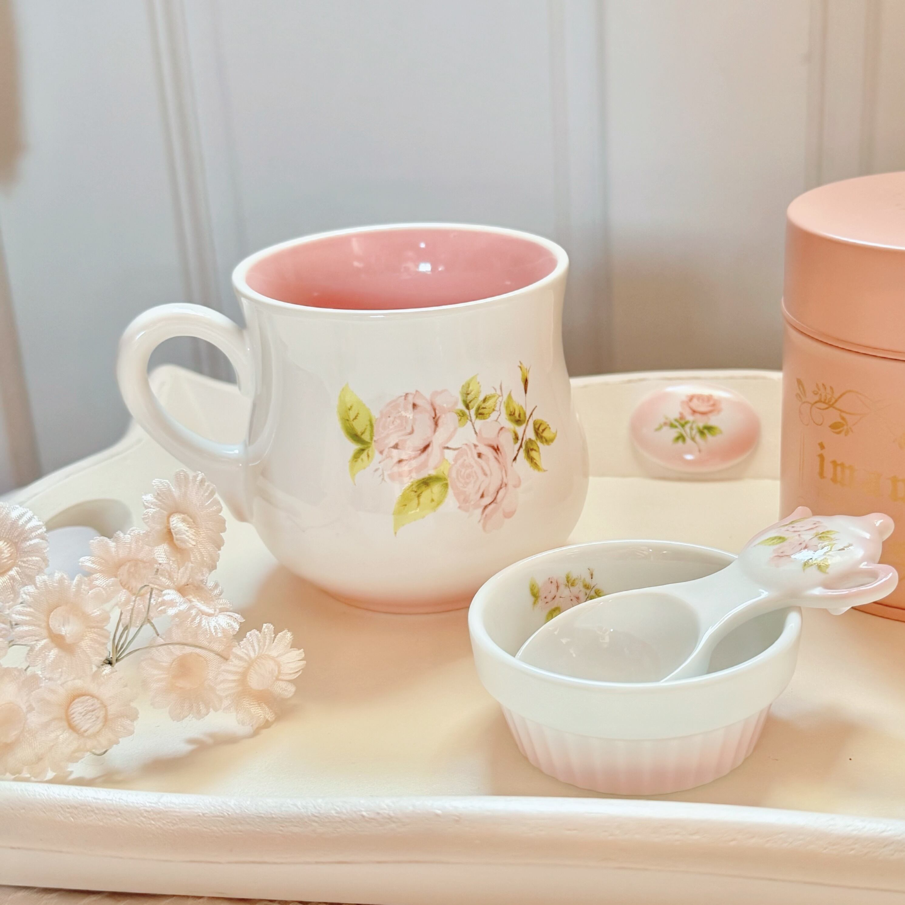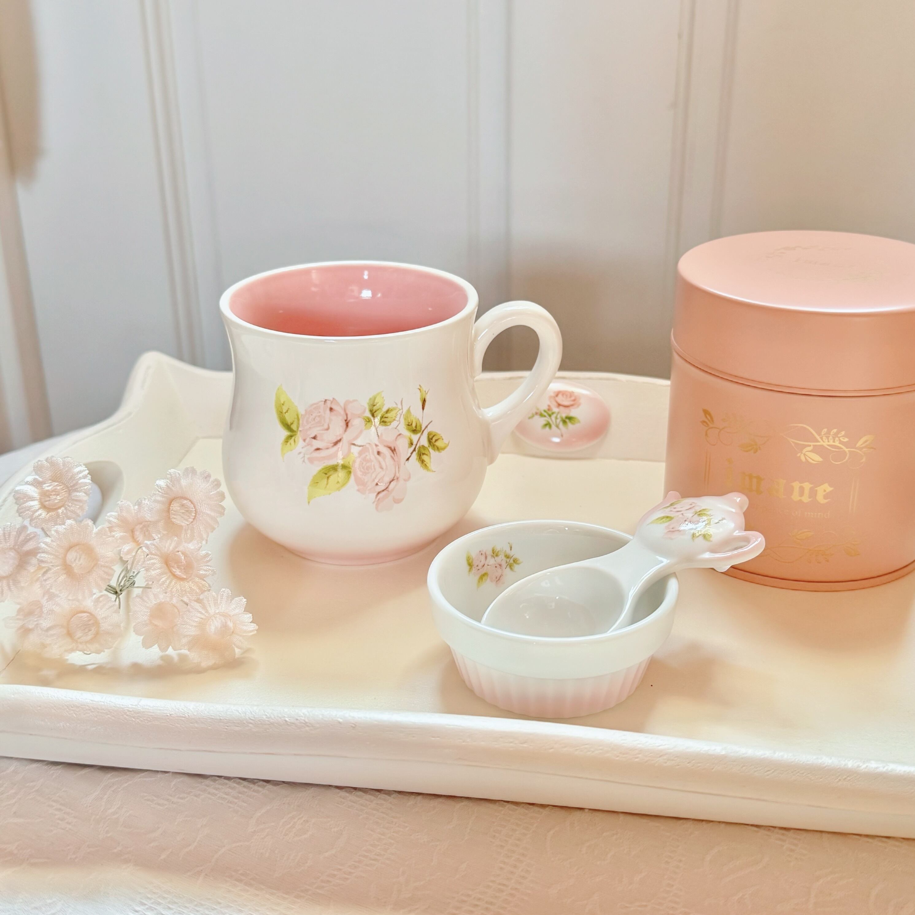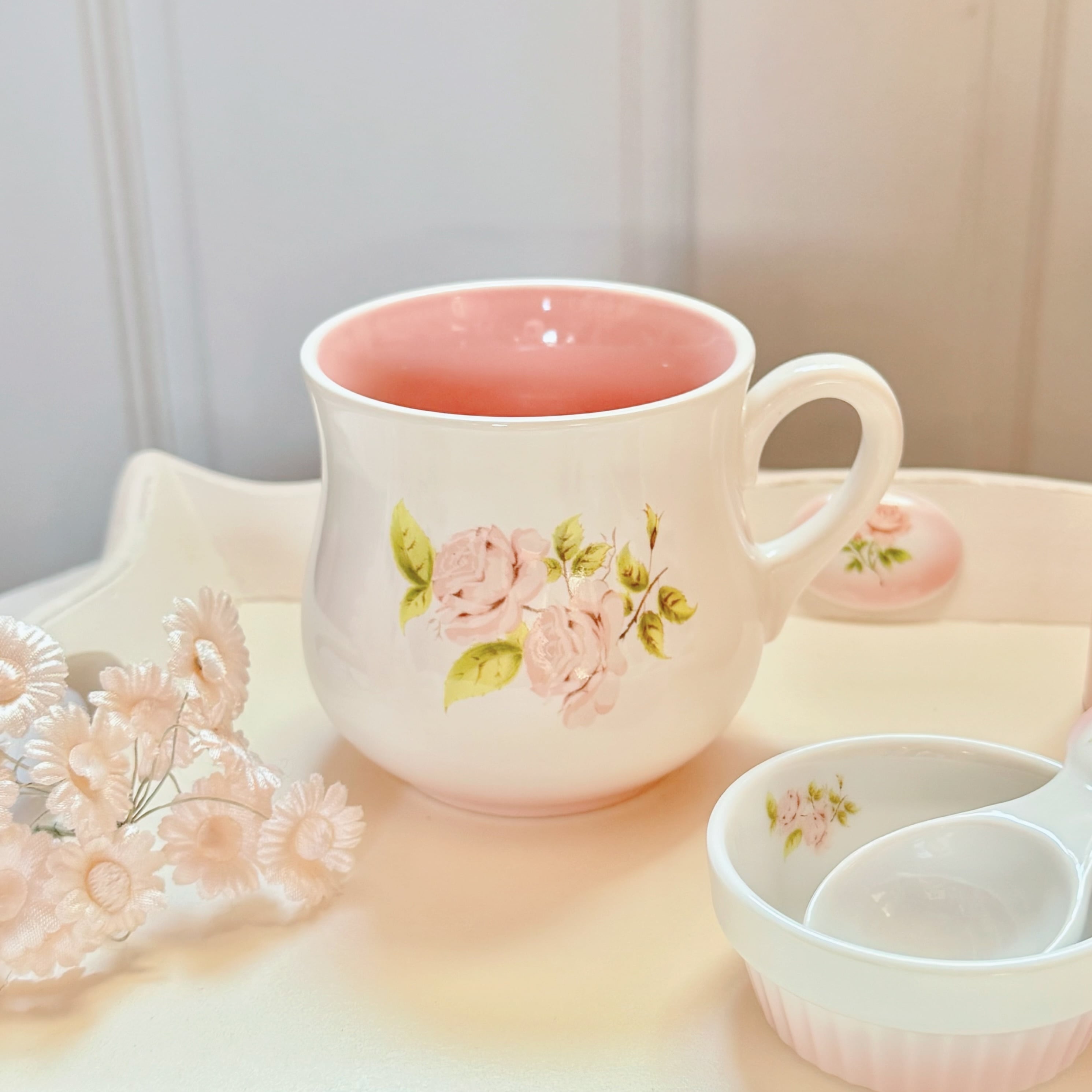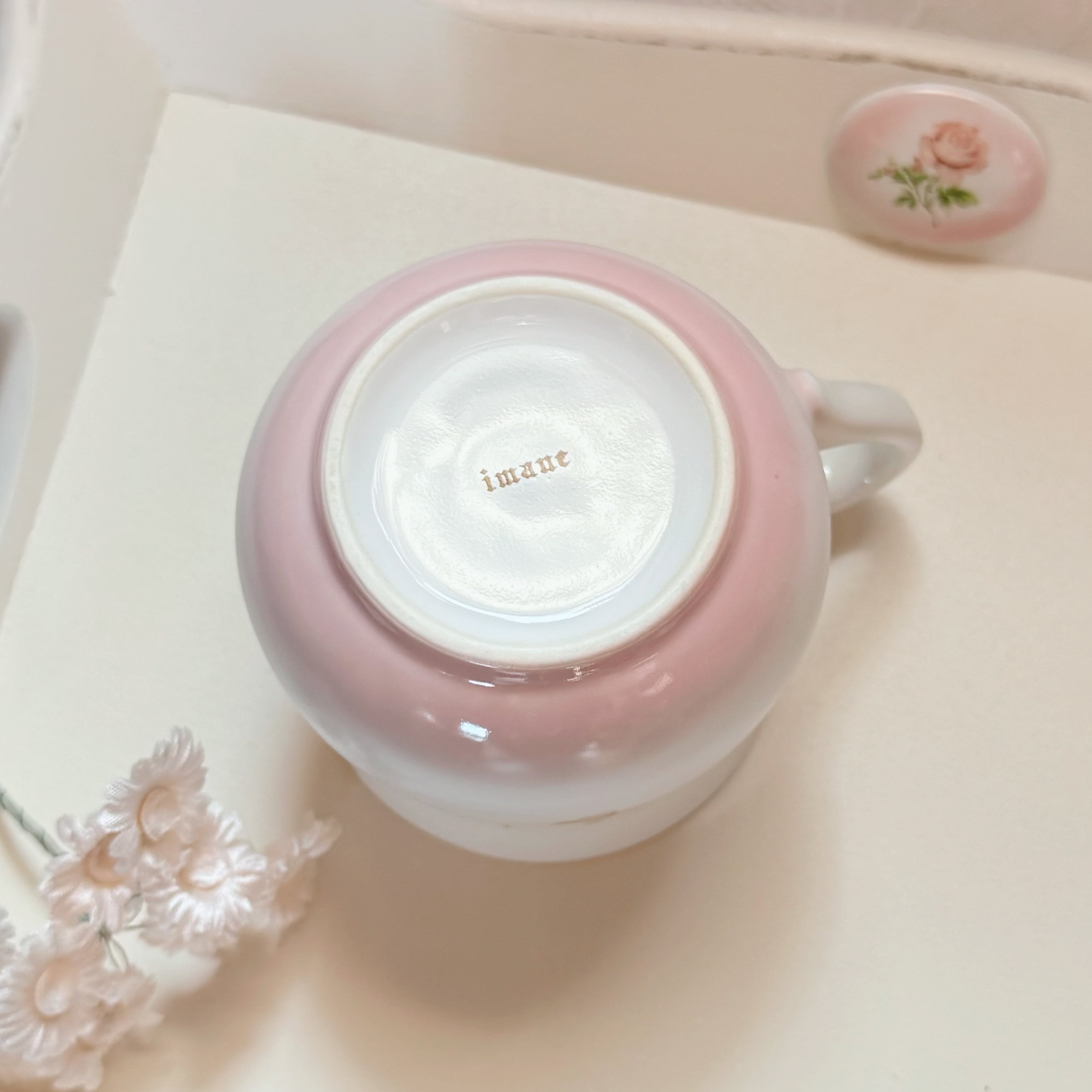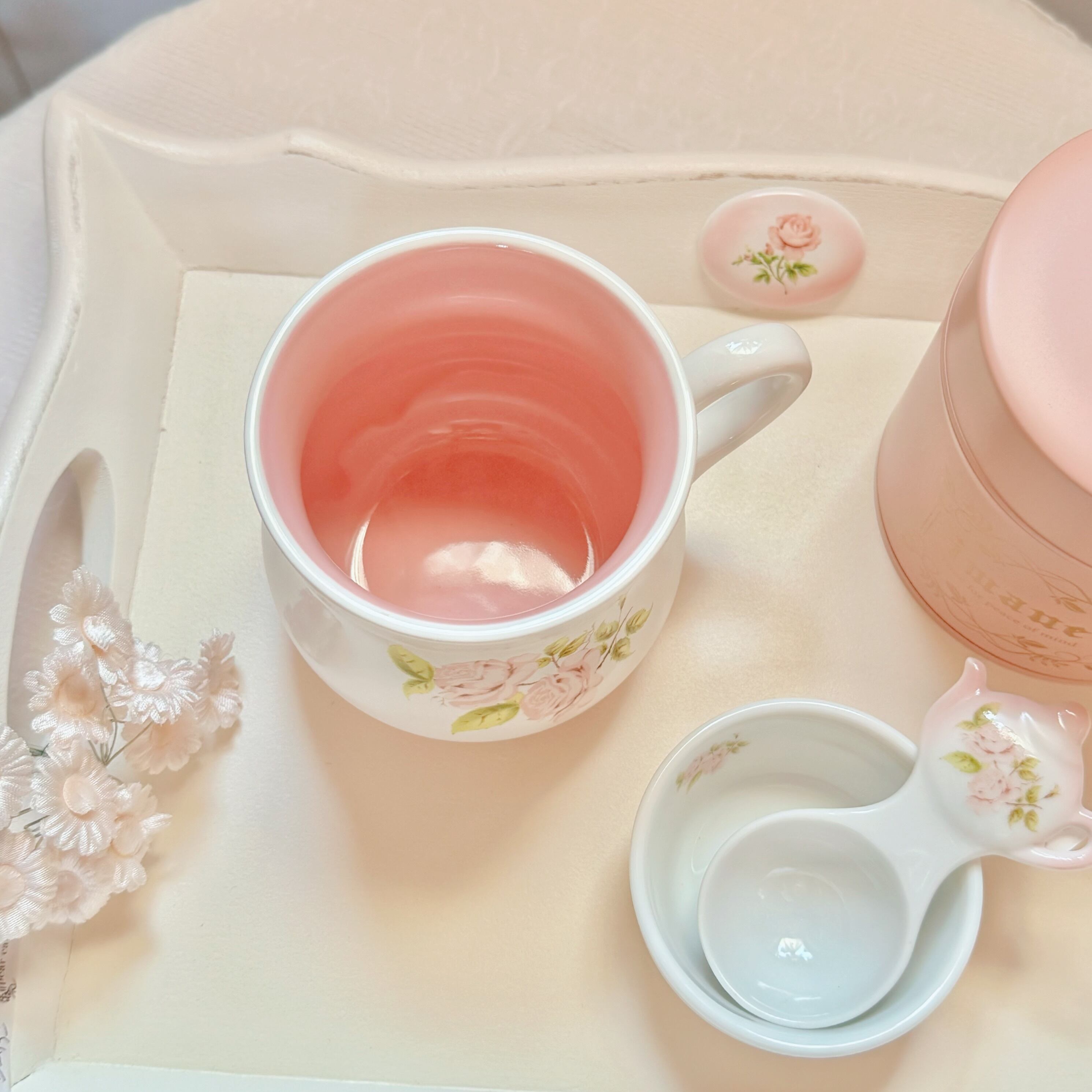 カップの内側は可憐なピンクで、飲み物を注ぐたびに華やかな気分にしてくれます⟡.·