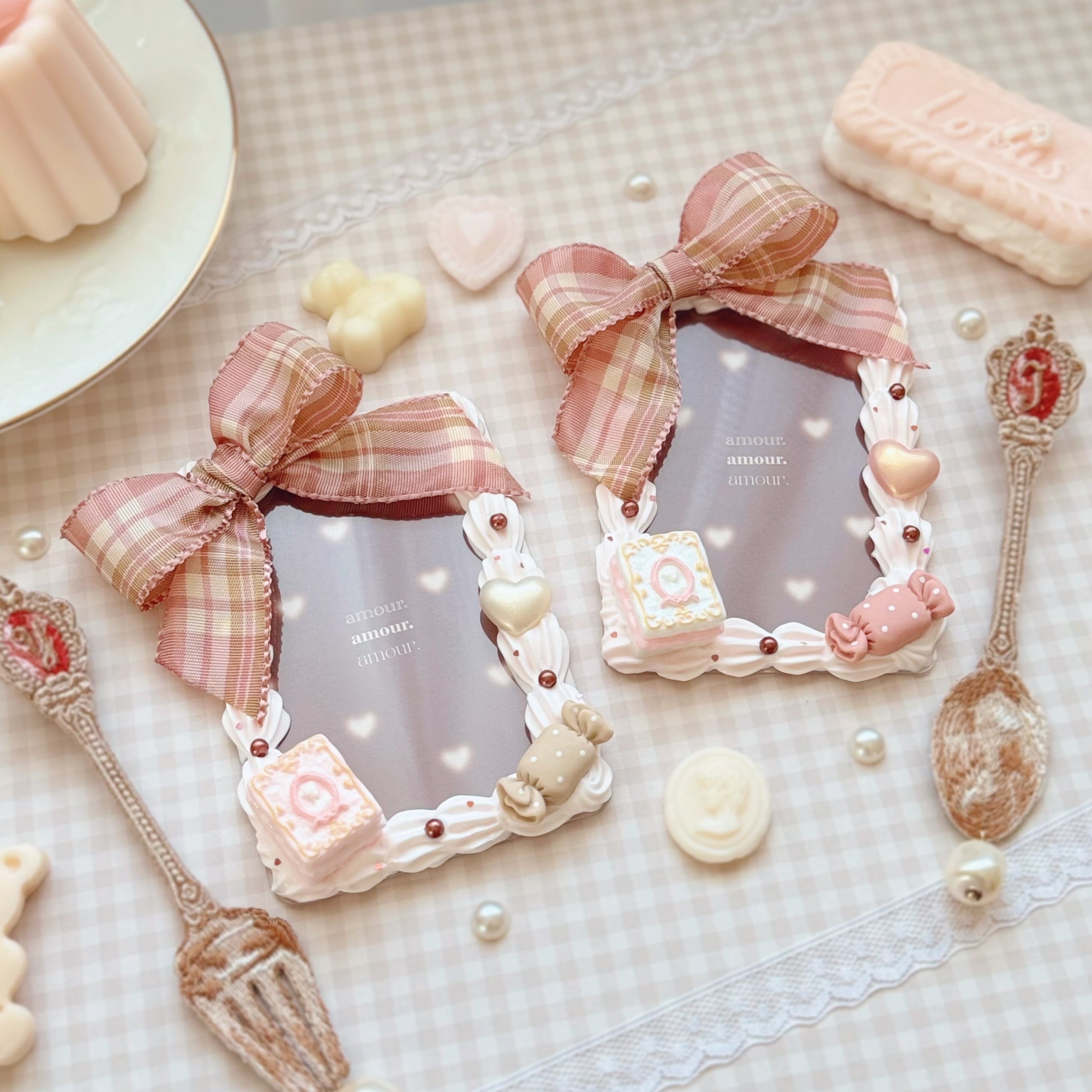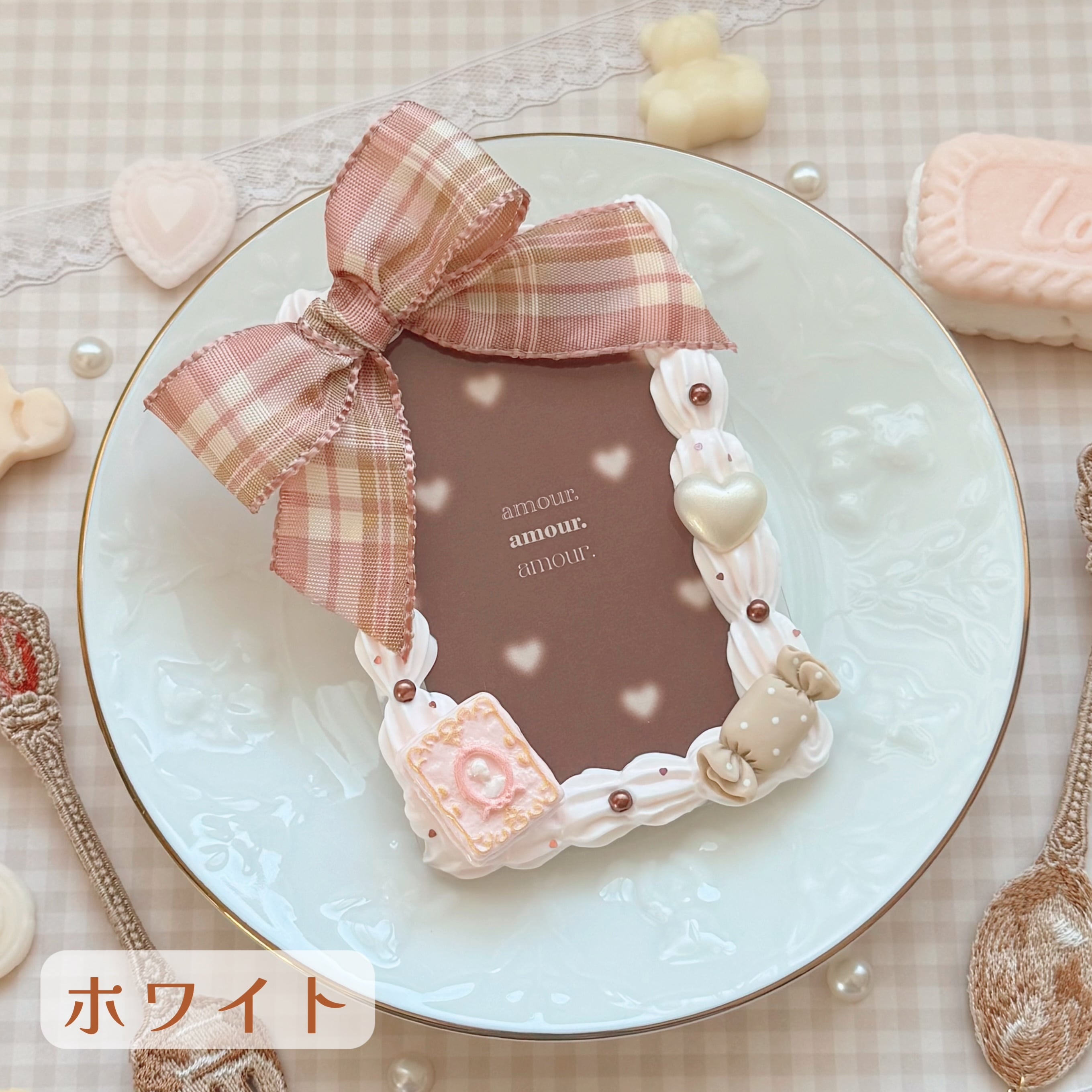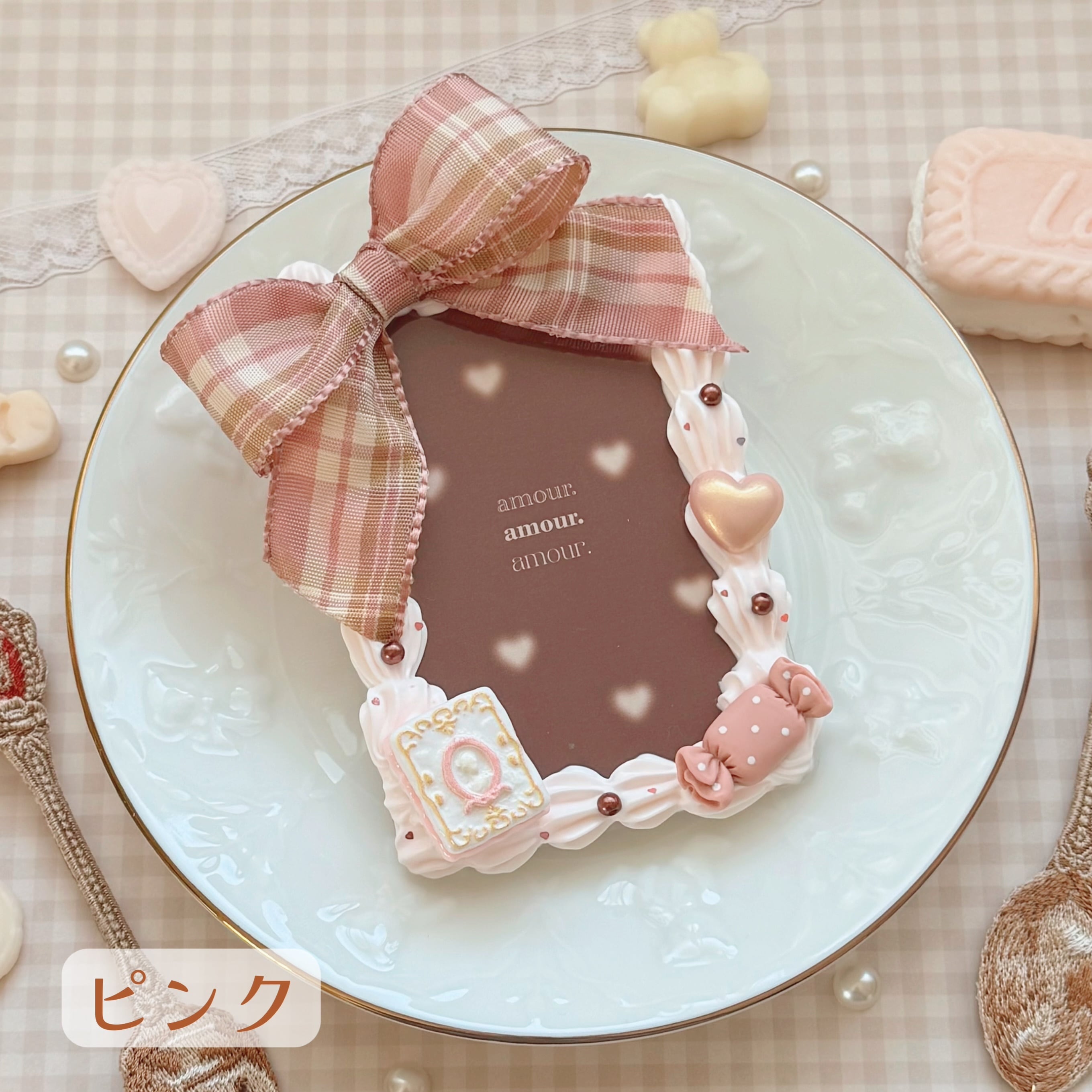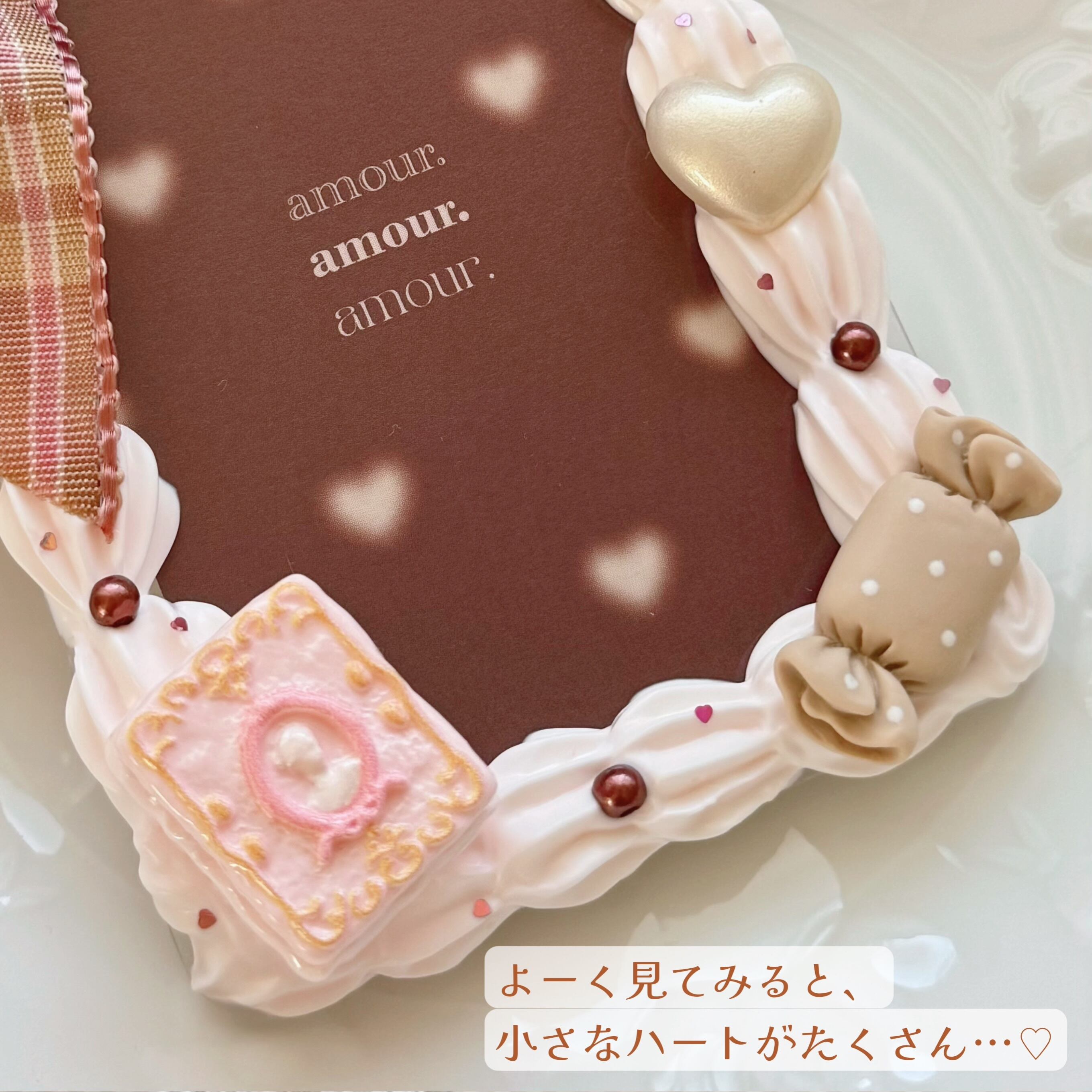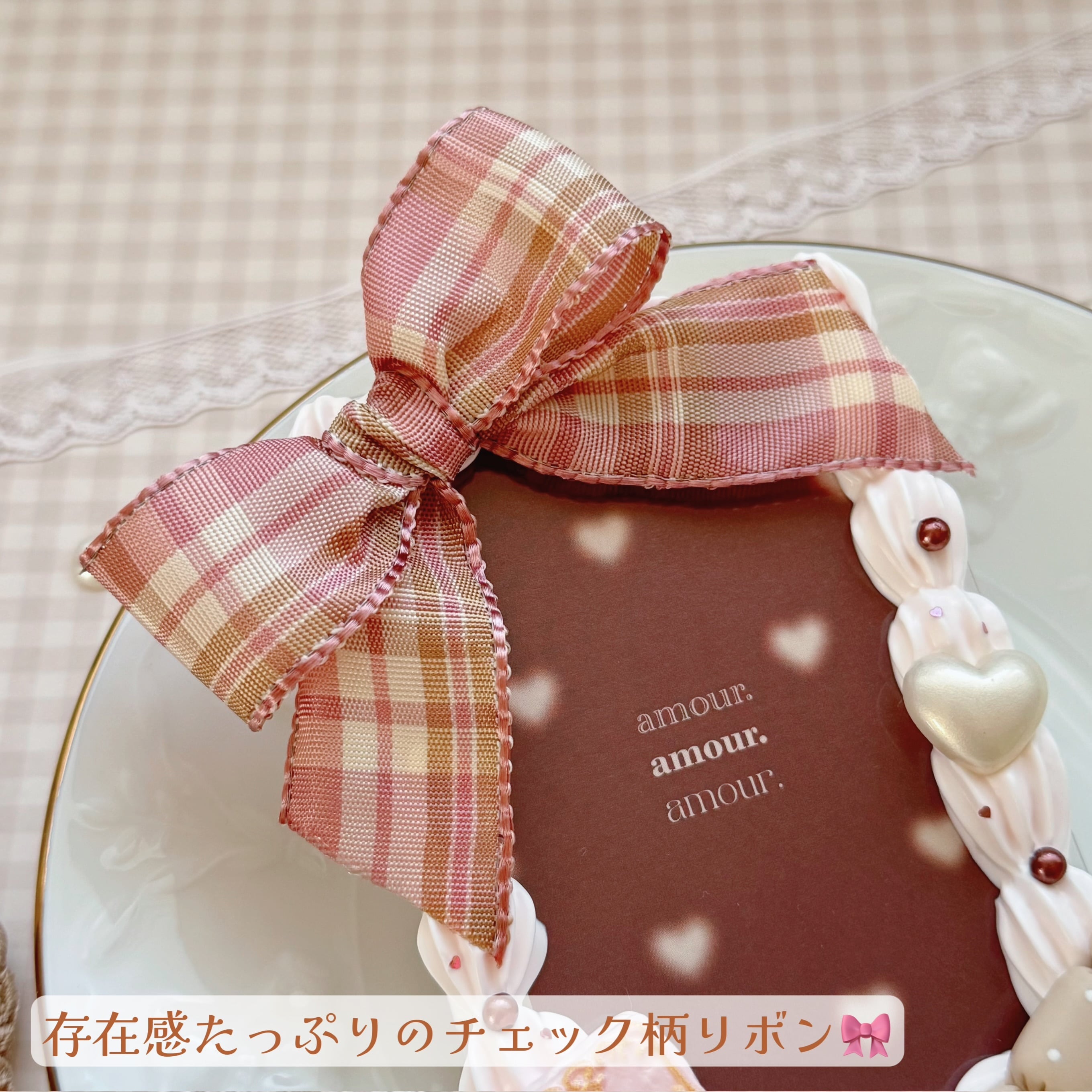 ◆パーツ:ブラウンピンクのチェック柄リボン、メルヘンカメオ、パールハート、マットなくすみキャンディー、チョコ風パール、ミニミニホロハート
