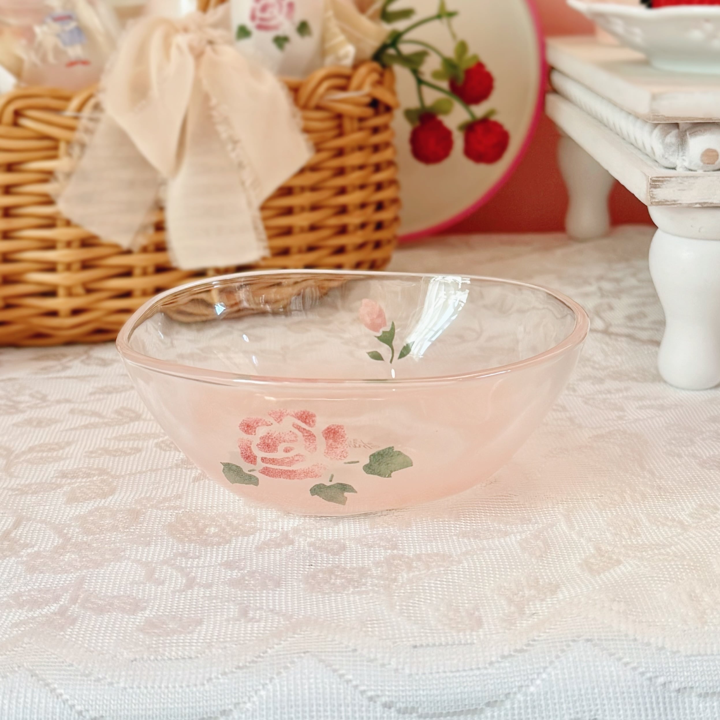 やさしいピンクのガラスに可憐なローズが描かれた