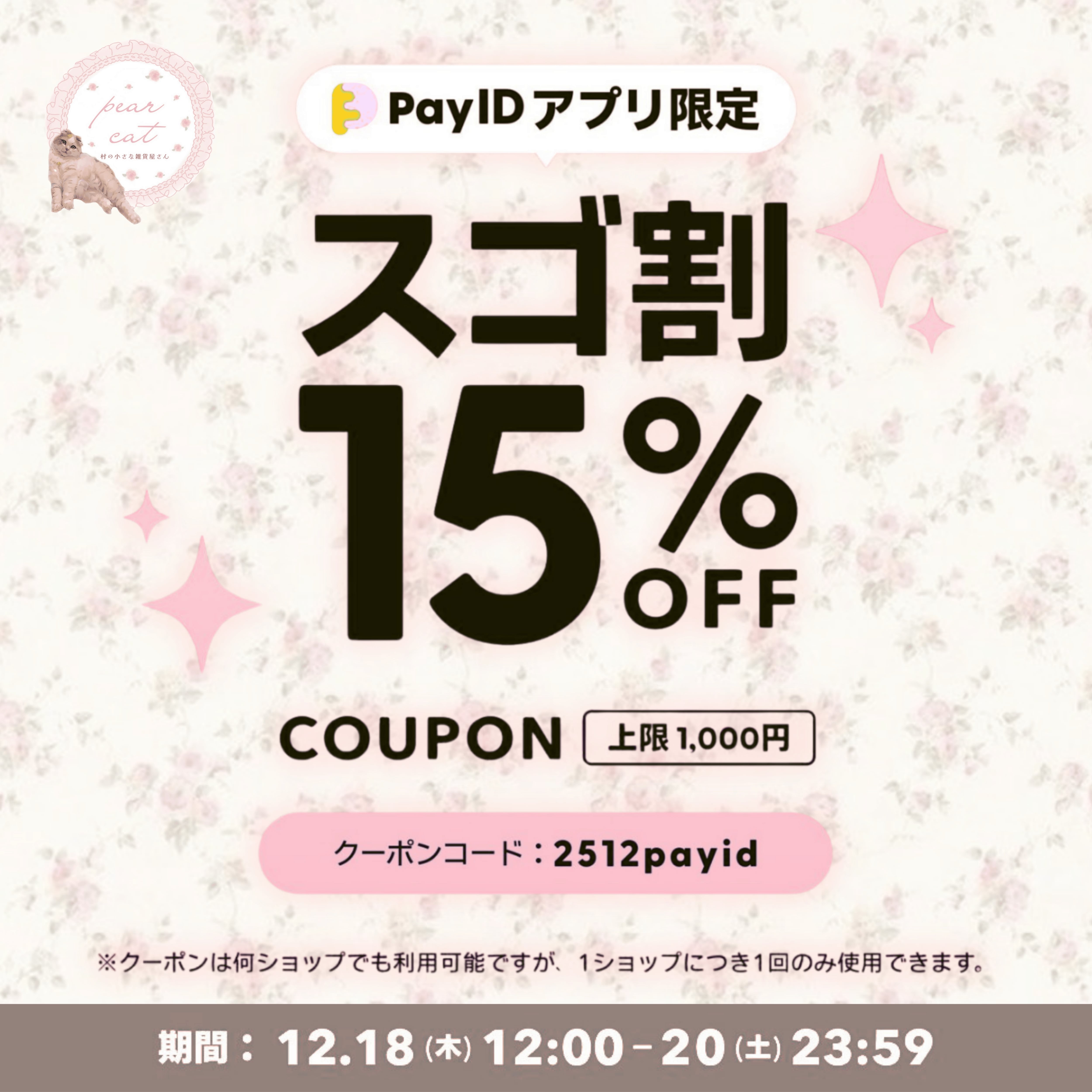 対象期間中にPayIDアプリからお買いものをしていただく際に、その場で使える15%OFF(上限1,000円)クーポンをプレゼント!